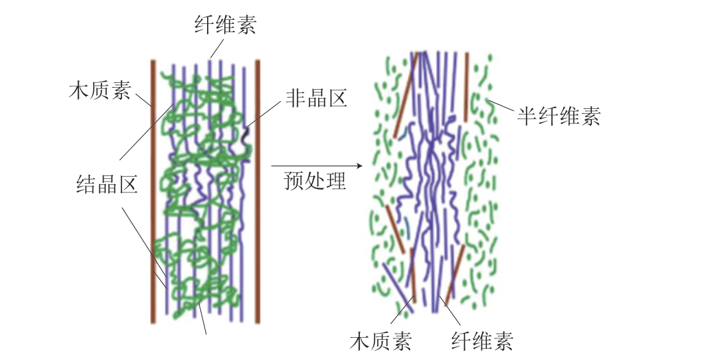 图3 木质纤维细胞壁预处理前后的结构示意图[21]