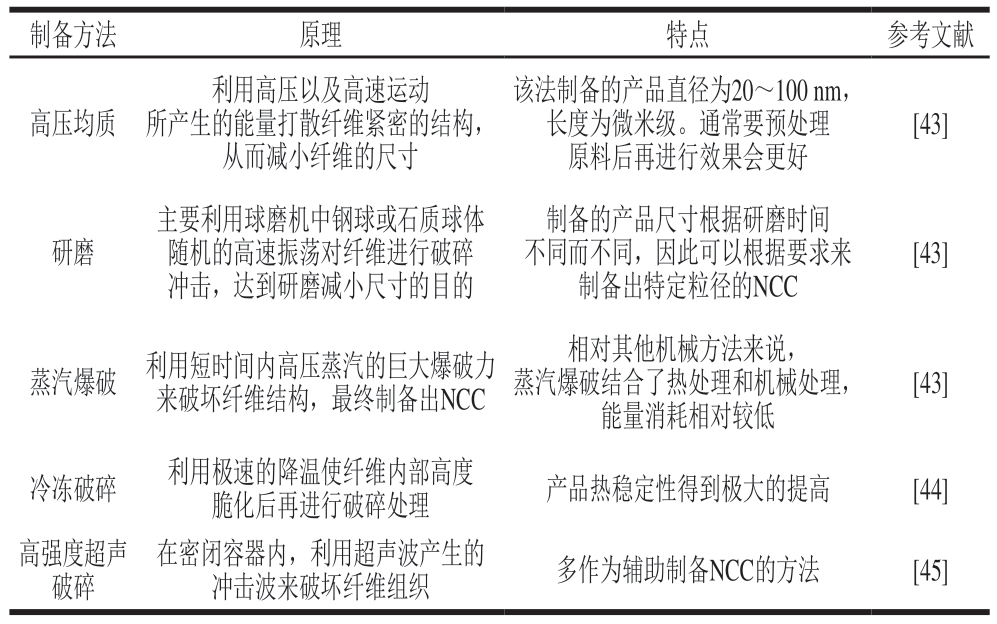 制备方法 原理 特点 参考文献高压均质利用高压以及高速运动所产生的能量打散纤维紧密的结构,从而减小纤维的尺寸该法制备的产品直径为20~100 nm,长度为微米级。通常要预处理原料后再进行效果会更好[43]研磨主要利用球磨机中钢球或石质球体随机的高速振荡对纤维进行破碎冲击,达到研磨减小尺寸的目的制备的产品尺寸根据研磨时间不同而不同,因此可以根据要求来制备出特定粒径的NCC[43]蒸汽爆破 利用短时间内高压蒸汽的巨大爆破力来破坏纤维结构,最终制备出NCC相对其他机械方法来说,蒸汽爆破结合了热处理和机械处理,能量消耗相对较低[43]冷冻破碎 利用极速的降温使纤维内部高度脆化后再进行破碎处理 产品热稳定性得到极大的提高 [44]高强度超声破碎在密闭容器内,利用超声波产生的冲击波来破坏纤维组织 多作为辅助制备NCC的方法 [45]