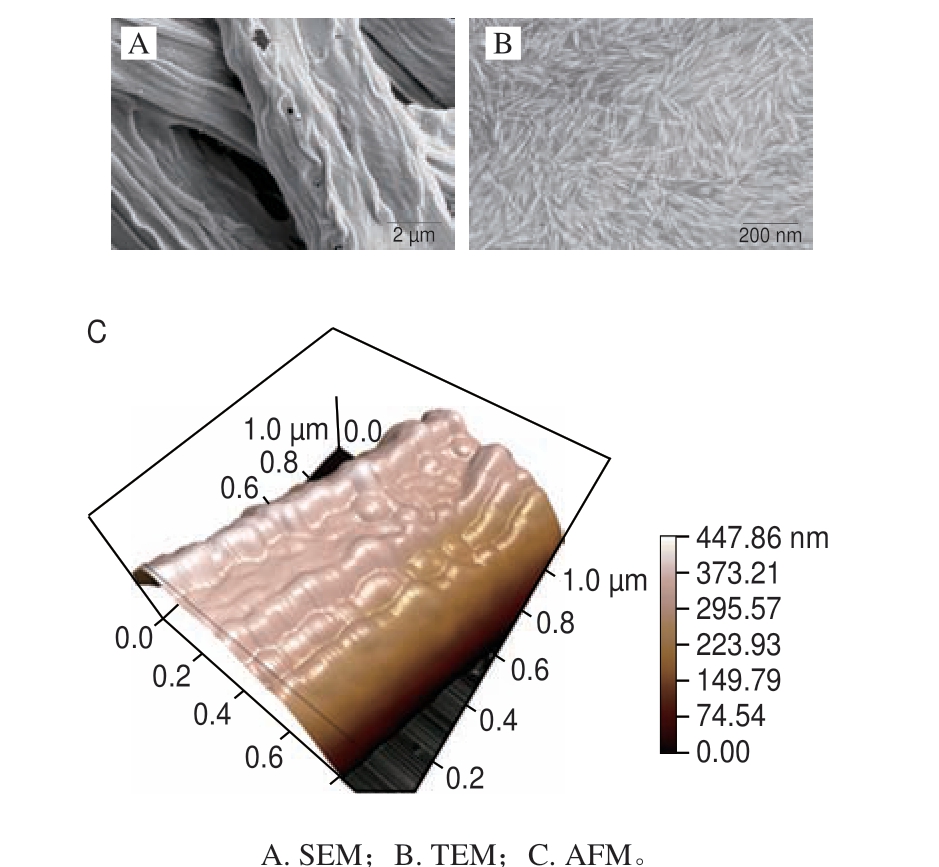 NCC的结构、形态及尺寸与产品质量密切相关,直接影响制备材料的物理化学性能。因此,针对NCC的性能以及在微观层面的各种测试与表征技术也是NCC研究的一个重要方面。目前常用的表征方法包括原子力显微镜(atomic force microscope,AFM)、透射电子显微镜(transmission electron microscope,T E M)、扫描电子显微镜(s c a n n i n g e l e c t r o n microscope,SEM)和X射线衍射(X-ray diffraction,XRD)等(表4),通过这些表征技术使NCC的微观结构与性质特点得以全面呈现(图6),进而为科研人员在新材料研制和开发、材料性能改进以及材料可靠性评价等方面构建完备的检测体系。