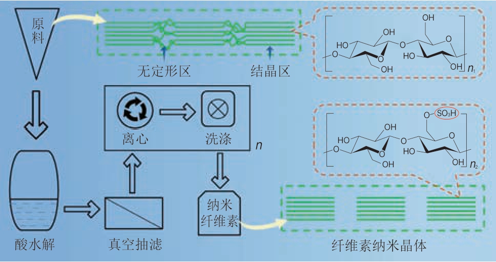 酸水解法最早由Nickerson和Habrle于1947年提出,他们用盐酸或硫酸水解木材、棉絮制备得到NCC。目前,国内外学者已利用酸水解工艺(图4)从上千种植物原料中提取得到NCC,并发现NCC的尺寸、形貌以及结晶度等特性很大程度上取决于原料特征,结晶度高的原料往往会制备得到较高长径比(length to diameter ratio,L/D)的纳米晶体[25]。另一方面,酸水解工艺参数也是影响CNC尺寸的一个重要因素,原因在于酸水解工艺本质上是一个控制水解的过程,酸中释放的氢离子首先攻击纤维素无定形区,而结晶区纤维因结构致密,对酸具有很强抵抗性而得以保留[26];但反应时间过长或温度过高,纤维素结晶区同样能被水解得到小分子葡萄糖。Kargarzadeh等[27]发现在洋麻制备NCC过程中,反应20 min和120 min时对应的NCC长度分别为(166.4±58.8)nm和(124.3±45.3)nm。而Xing Lida等[28]以桉树为原料在硫酸质量分数分别为58%和64%时反应30 min的平均长度为(146.7±61.8)nm和(122.1±45.5)nm。可见,不同纤维素原料对酸的抵抗程度不同,选择适宜的酸水解条件对制备理想的CNC产品至关重要。王硕等[29]利用微晶纤维素在最优条件下(硫酸质量分数60%、温度50 ℃)反应2 h可以获得粒径介于50~100 nm的CNC,并且由于硫酸根离子与纤维素表面的—OH基团发生酯化反应,使其带负电荷,从而形成了稳定的胶体结构。另外,不同酸水解得到的NCC性质也有所不同。Yu Houyong等[30]采用盐酸处理得到的CNC产率高达93%,最大热分解温度达到364 ℃,显著高于硫酸处理制得的样品。但盐酸水解得到的CNC由于表面基本没有带电荷的基团,所以产物在水中的分散性受到限制,更容易聚集絮凝。周升和等[31]发现磷酸水热法酸解2 h制得的产品(p-CNC)比硫酸法制得的产品(s-CNC)在初始分解温度方面有很大提升,质量损失率5%时对应的分解温度由s-CNC的269 ℃提高到p-CNC的306 ℃。