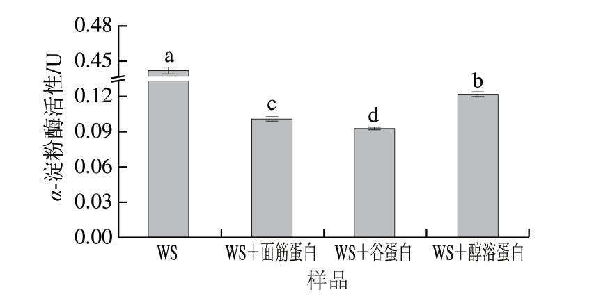 由图6可知,WS样品的α-淀粉酶的活性为0.438 U,显著高于添加不同面筋蛋白组分的样品(P<0.05)。在WS+谷蛋白样品中观察到α-淀粉酶的活性最低,为0.092 U,显著低于WS+面筋蛋白(0.101 U)和WS+醇溶蛋白(0.121 U)样品。这些结果表明,面筋蛋白、谷蛋白及醇溶蛋白均能与α-淀粉酶相互作用并降低其活性。并且,谷蛋白与α-淀粉酶的结合程度最大,强于面筋蛋白和醇溶蛋白。