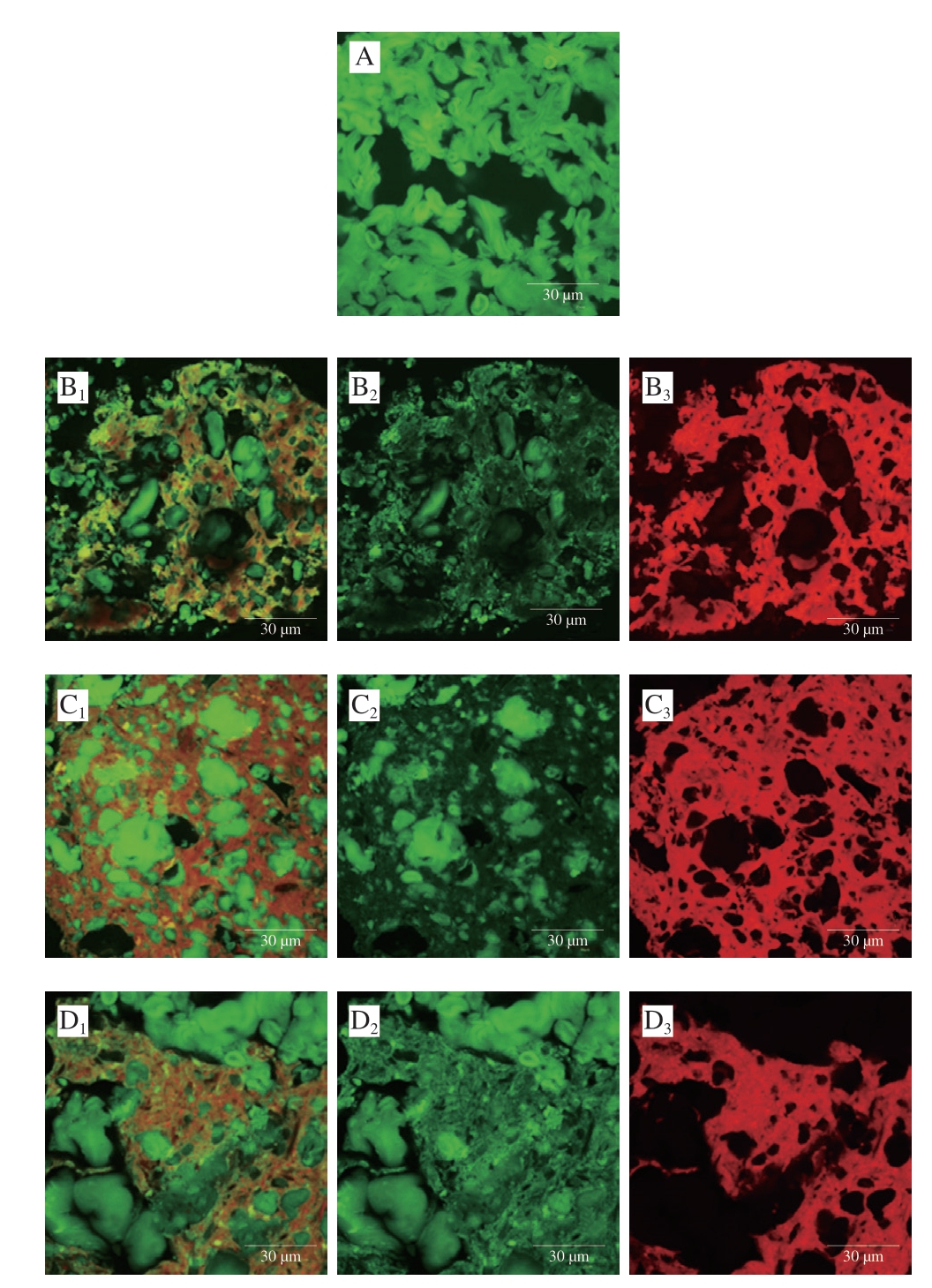 A~D.分别为WS、WS+面筋蛋白、WS+谷蛋白、WS+醇溶蛋白;下标1~3.分别代表WS+蛋白体系、WS和蛋白形貌;绿色部分为淀粉,红色部分为蛋白质。