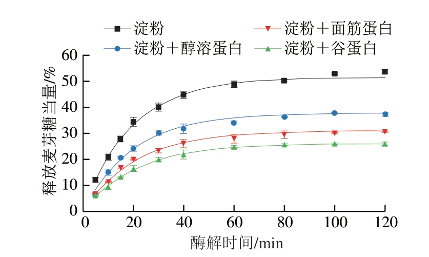 食品的多组分体系中,淀粉和蛋白质往往共存。加工过程中,蛋白质与淀粉之间存在一定的相互作用,并且蛋白质会黏附在淀粉颗粒基质的周围成为淀粉消化的屏障,这很大程度上降低了淀粉的消化率[7]。此外,蛋白质也会与α-淀粉酶相互作用降低酶的活性,阻碍淀粉酶与淀粉分子的结合,从而抑制淀粉的消化[8]。面筋蛋白作为小麦粉中仅次于淀粉的第二大宏量营养成分,主要由聚合体谷蛋白(含量30%~40%,分子质量105~107 Da)和单体醇溶蛋白(含量40%~50%,分子质量3×104~8×104 Da)组成[9]。谷蛋白肽链之间通过二硫键交联形成面筋蛋白网络的骨架结构,而醇溶蛋白则主要通过非共价作用力与谷蛋白相互作用,并填充在网络结构中。已有研究表明,随着面筋蛋白及其水解物的增加,淀粉的消化速率和程度逐渐下降。这主要是由于面筋及其水解物对α-淀粉酶活性的抑制作用,从而降低了α-淀粉酶与淀粉的结合程度[10]。此外,在面粉中添加额外的面筋蛋白也会降低α-淀粉酶对淀粉的水解,这主要是因为面筋蛋白会包裹更多的淀粉,及其对α-淀粉酶更强的抑制作用[11-12]。然而,目前尚不清楚面筋蛋白组分中的谷蛋白和醇溶蛋白如何与淀粉/α-淀粉酶相互作用从而影响淀粉的消化特性,这可以从组分学角度完善面筋蛋白影响淀粉消化特性的机理。