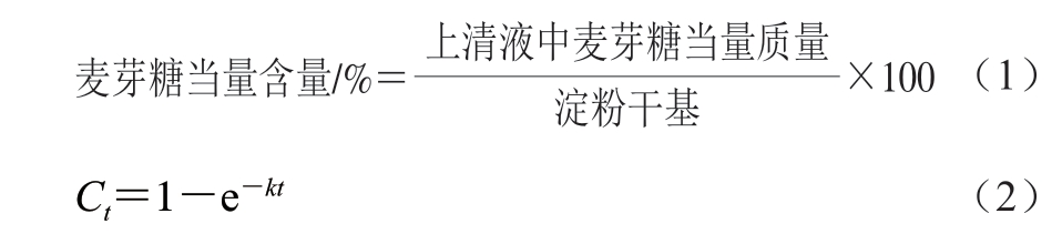 使用PAHBAH法测定上清液中麦芽糖含量[13]。将一定质量的PAHBAH溶解在5 mL 0.5 mol/L盐酸和45 mL 0.5 mol/L氢氧化钠的混合溶液中制成质量分数为5% PAHBAH的显色剂。分别取100 μL不同质量浓度的麦芽糖溶液(31.25、62.5、125、250、500 μg/mL)与3 mL 5% PAHBAH显色剂混合,避光条件下沸水浴5 min,冷却至室温后在410 nm波长处测定吸光度,得到麦芽糖的标准曲线。样品上清液的显色方法与麦芽糖标准曲线的显色制作方法相同。通过式(1)计算上清液中的麦芽糖当量含量,以麦芽糖释放当量含量表示淀粉消化率。通过式(2)的一阶动力学方程对消化过程进行模拟。所有样品经过3 次平行测定。