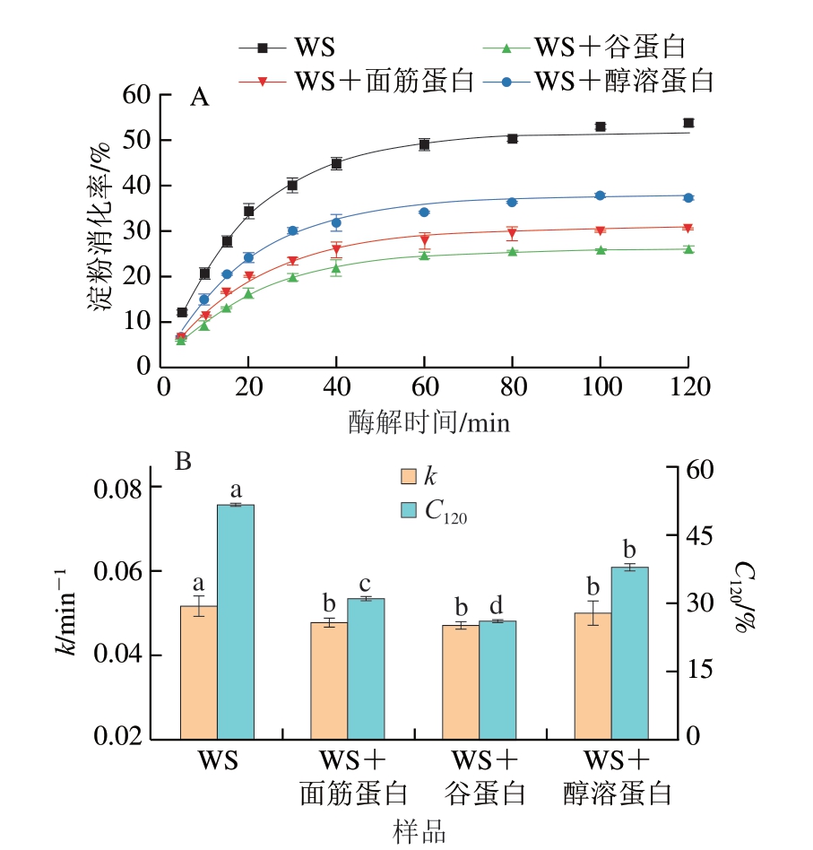 由图1B可知,通过消化动力学方程拟合得到的酶解120 min时的淀粉消化率(C120)与实际所得数据之间差异不大,而且只有一个速率常数。这不同于颗粒态未蒸煮的淀粉样品,它们在较高酶用量下的消化速率曲线呈现出两个阶段[12]。这说明整个消化过程可以完美拟合一级动力学方程,并且含淀粉的底物可能只包含一种特异的结构片段。这也意味着通过该消化动力学方程获得k和C120值可靠[11]。WS样品的k及C120值最大,均显著高于添加不同面筋蛋白组分的样品(P<0.05)。与WS相比,WS+面筋蛋白、WS+谷蛋白和WS+醇溶蛋白样品的C120值分别下降了39.93%、49.48%和26.61%。这与Xu Hanbin等[10]在面筋蛋白-淀粉复合体系中观察到的结果相似,他们发现添加了面筋蛋白的淀粉体系的C120值从62.2%下降到25.4%,这与面筋蛋白与淀粉/α-淀粉酶之间的相互作用有关。这些结果表明,不同面筋蛋白组分的添加显著降低了WS的消化率;并且在相同添加量下,谷蛋白对WS消化的抑制作用明显高于面筋蛋白和醇溶蛋白。有研究表明[10],蛋白质的存在显著抑制了淀粉消化率,主要归因于蛋白-淀粉/淀粉酶的相互作用;蛋白质的存在阻断了淀粉与消化酶的结合位点并形成抑制淀粉消化的物理性屏障。此外,蛋白质也会抑制淀粉酶的活性,阻碍了淀粉酶与淀粉分子的结合[12]。已有研究表明[20],蛋白-淀粉混合体系的升糖指数与淀粉消化速率和消化率呈正相关。相比于面筋蛋白和醇溶蛋白,谷蛋白对淀粉消化更显著的抑制作用可能与蛋白质的结构以及与淀粉/淀粉酶的结合强度有关。