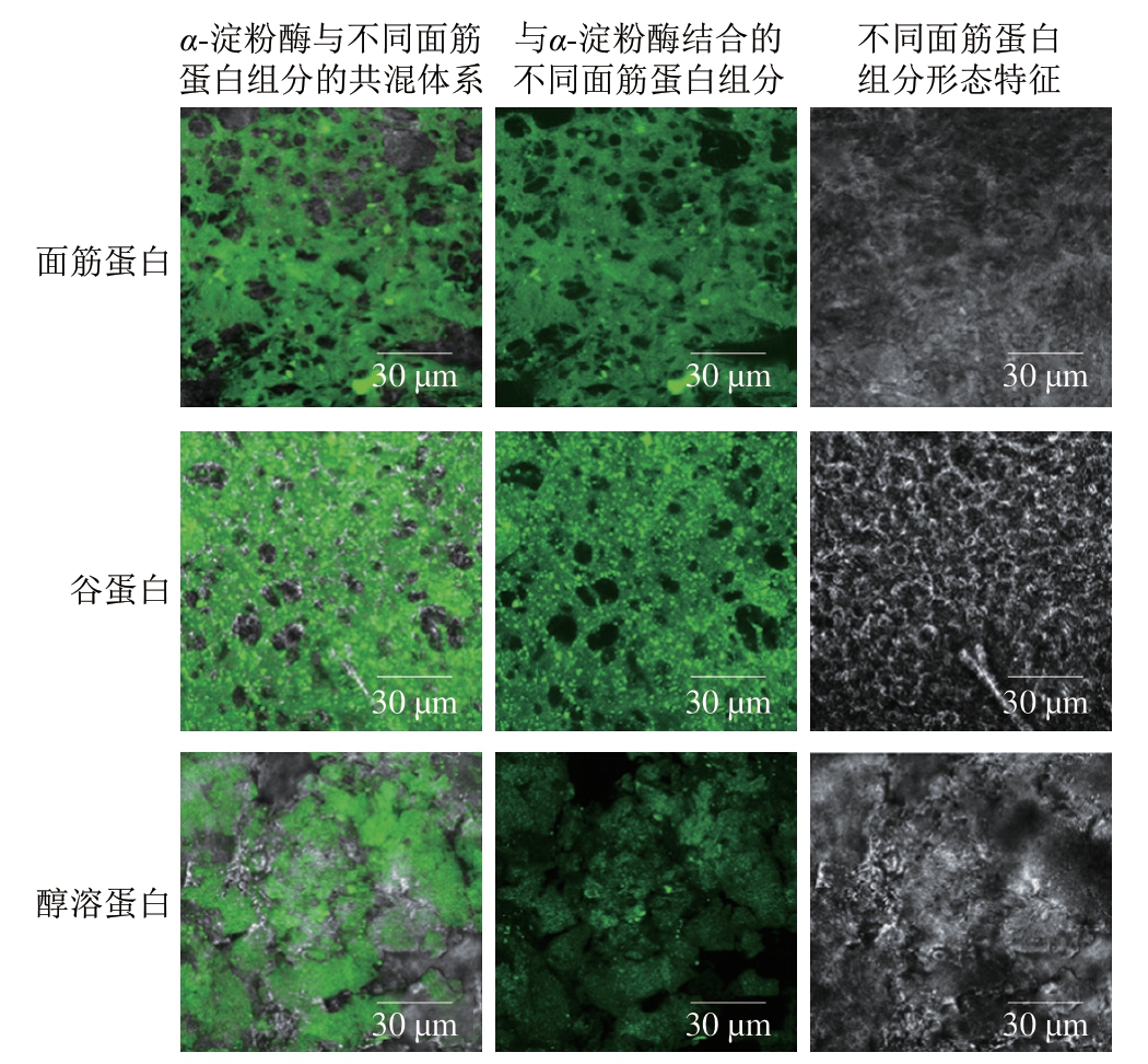 如图7所示,添加面筋蛋白、谷蛋白和醇溶蛋白的样品存在明显的荧光现象,表明经过FITC标记过的α-淀粉酶与面筋蛋白、谷蛋白及醇溶蛋白之间发生了明显的相互作用,并形成了比较稳定的复合物。此外,明显地观察到谷蛋白与α-淀粉酶结合程度更大,结合的蛋白部分呈现致密的网络状态且分布更加连续;而醇溶蛋白与α-淀粉酶结合程度较低,结合区域比较分散且不均匀。这种差异可能与不同面筋蛋白结构密切相关。谷蛋白各亚基进行紧密折叠并通过芳香族侧链等疏水作用相互键合,呈现较为疏水的构象;而球状的醇溶蛋白分子间通过氢键、静电相互作用及疏水相互作用等非共价键连接,并形成稳定且紧凑的三维结构[9,34]。因此,相比醇溶蛋白,热处理后谷蛋白分子构象的改变以及在共混体系中的分散行为是与α-淀粉酶更大程度结合的主要原因,这也为解释谷蛋白对α-淀粉酶活性更强的抑制作用及其抑制机理提供了直接的证据。