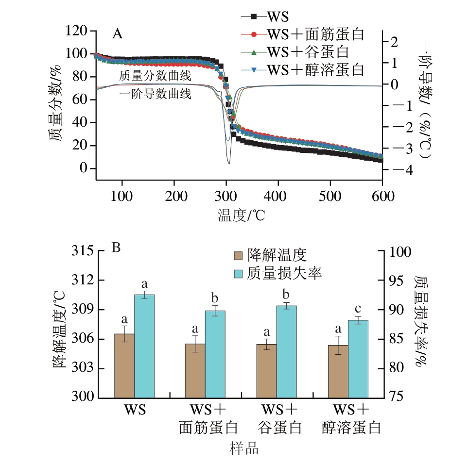 根据热重分析曲线得到每个样品的降解温度,如图4B所示,WS样品的降解温度和质量损失率分别为306.52 ℃和92.46%;不同面筋蛋白组分的添加对热降解温度没有显著影响,但显著降低了质量损失率。WS+醇溶蛋白样品(88.18%)的质量损失率显著低于WS+面筋蛋白(89.79%)和WS+谷蛋白(90.64%)样品(P<0.05)。质量损失率越低,表明样品的热稳定性越好。与谷蛋白多肽链分子间的二硫键相比,热处理过程中醇溶蛋白分子内的二硫键更难断裂[28],这可能是导致淀粉-醇溶蛋白共混物的质量损失率更低的主要原因。此外,也有研究表明,淀粉糊化过程中,WS与醇溶蛋白可以通过糖苷键结合形成更稳定的复合物。糖苷键的形成有利于复合物热稳定性的提高,并且会更大程度地阻碍α-淀粉酶对淀粉的水解[29]。