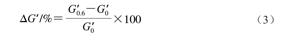 1.3.3 淀粉与不同面筋蛋白组分之间相互作用力的测定为了确定淀粉和不同面筋蛋白组分之间的相互作用力,将3 g样品分散在50 mL 0.6 mol/L氯化钠或脲溶液中,将样品悬浮液在95 ℃、300 r/min糊化15 min,冷却至室温后进行流变学频率扫描[14]。具体程序为:25 ℃保持2 min,间隙1 mm,恒定应变0.1%,频率扫描范围0.1~10 Hz,记录弹性模量(G’)随频率的变化。通过式(3)计算弹性模量差值(ΔG’)的变化,反映共混物体系相互作用力的变化。