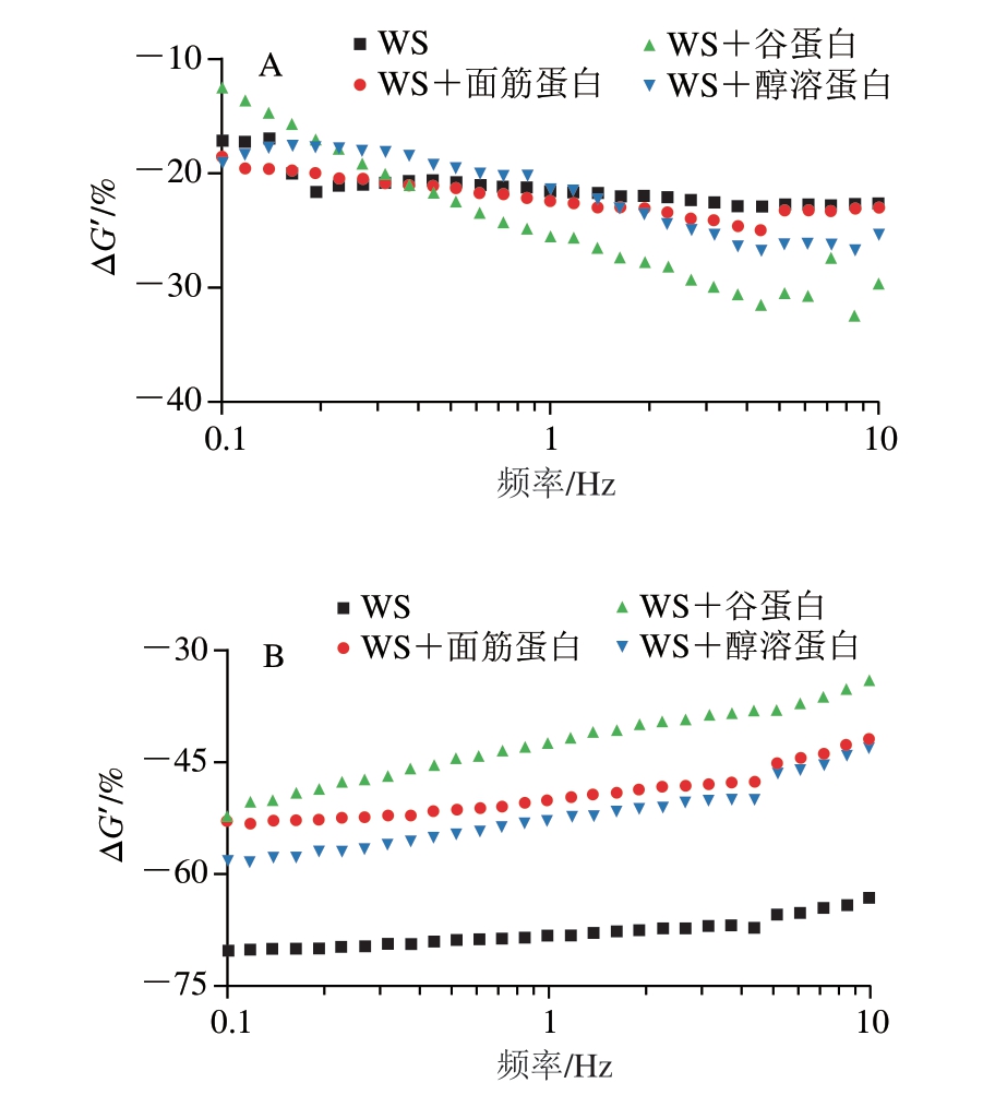 如图3所示,添加了氯化钠和脲的WS样品ΔG’值均小于0,即样品G’值降低,表明静电相互作用和氢键是维持纯淀粉糊化后凝胶形成的主要作用力。由图3A可知,在氯化钠作用下,面筋蛋白、谷蛋白及醇溶蛋白对淀粉ΔG’值的变化影响不大,这说明静电相互作用基本上不参与不同面筋蛋白组分与淀粉之间的相互作用[16]。研究发现,Na+和淀粉上带负电的羟基之间的静电相互作用可以有效减少淀粉-水和淀粉-淀粉之间的相互作用,导致弱凝胶的形成,从而降低淀粉的G’[22-23]。即使添加带正电荷的面筋蛋白组分也不会影响共混物体系中的静电相互作用,这可能是由于在热处理过程中蛋白质表面的电荷分布被改变,从而导致氯化钠处理下共混物体系的ΔG’值差异不明显。