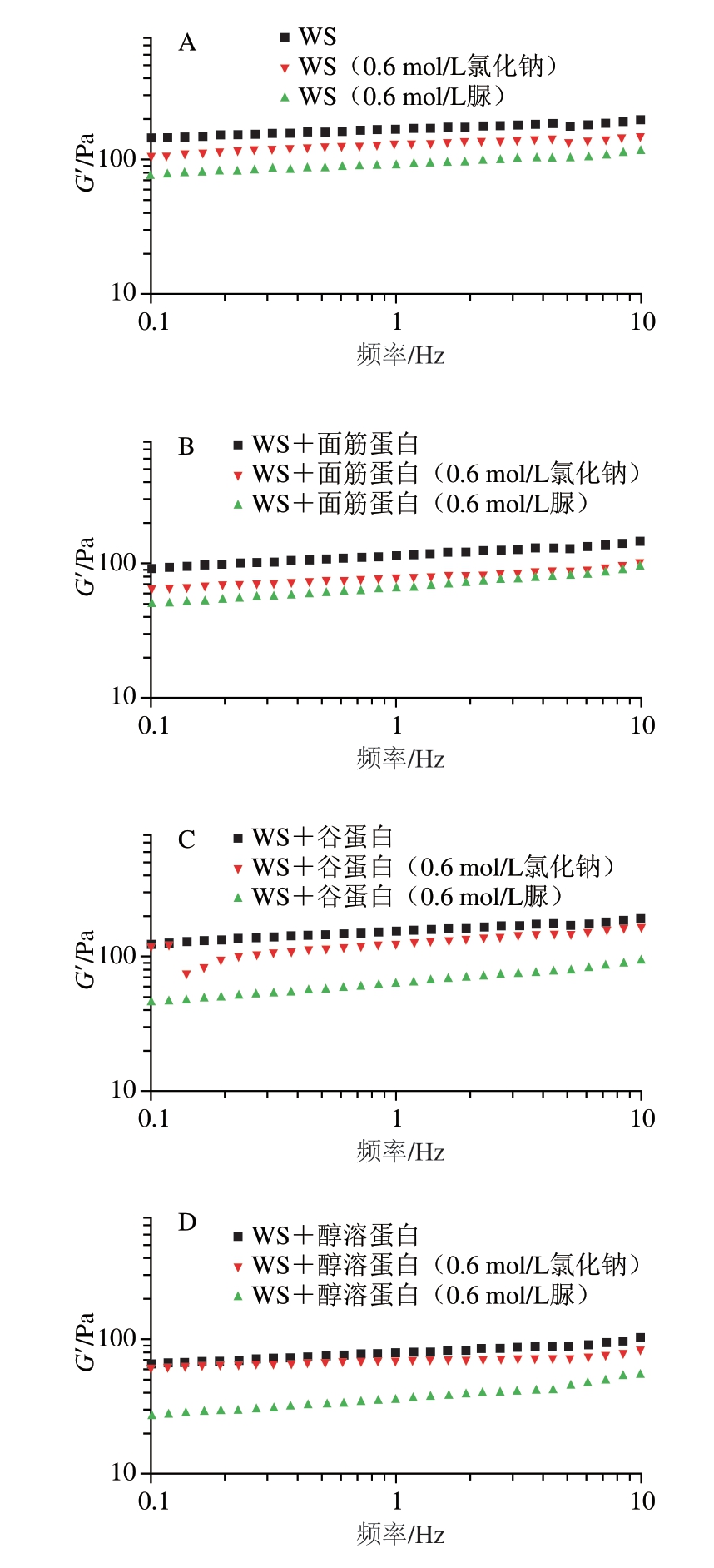 为特定频率扫描下含0.6 mol/L氯化钠或脲的样品G’;