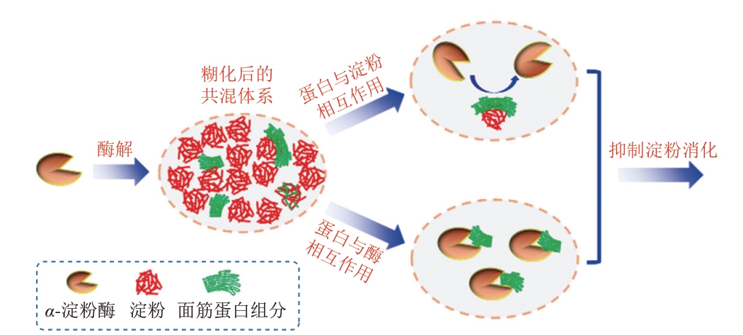 综上所述,提出了不同面筋蛋白组分抑制淀粉消化的机理(图8)。一方面,淀粉被面筋蛋白组分包裹以形成物理性屏障(并存在一定的非共价相互作用),这抑制了α-淀粉酶与淀粉的结合,导致淀粉的消化率降低。另一方面,不同的面筋蛋白可以与α-淀粉酶结合形成复合物,抑制了α-淀粉酶的活性,从而降低淀粉的酶解效率。