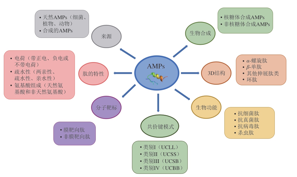 图3 基于来源、理化性质、分子靶点、共价键模式、生物功能、结构和生物合成的AMPs分类