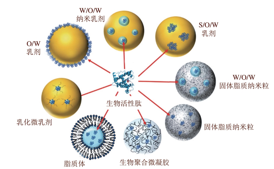 为提高多肽的生物利用度,通常可制备多肽微胶囊和多肽纳米胶囊,降低胃肠消化系统对多肽的消化作用。一些常见的多肽包埋运载系统有微乳剂(水包油(oil in water,O/W)、油包水乳剂(water in oil,W/O))、乳化微乳剂(水包油包水(water-in-oil-inwater,W/O/W))、乳剂(O/W或W/O)、纳米乳剂(O/W或W/O)[13]、固体脂质纳米粒、脂质体和生物聚合微凝胶[14-15](图2)。在抗肿瘤研究中,多肽的包埋不会使其丧失抗肿瘤活性[16]。此外,微胶囊包埋还可以被应用于疫苗生产[17],这些研究结果为活性肽生物利用度的研究指明了方向。多肽的包埋可以防止多肽摄入后被消化降解,或防止其他因素(如氧化)导致的降解,还可以控制肽的释放(速率及环境条件)、增强肽的稳定性、降低多肽的毒性[3,18]。对于多肽的包埋,需要研究多肽的运载系统和终产品特性。对于活性肽本身,除分析其分子质量、电学性质、极性、溶解度、表面活性和稳定性外,还需要研究包埋后多肽颗粒的组成、大小和形状、界面属性和聚集状态等特性[14]。
