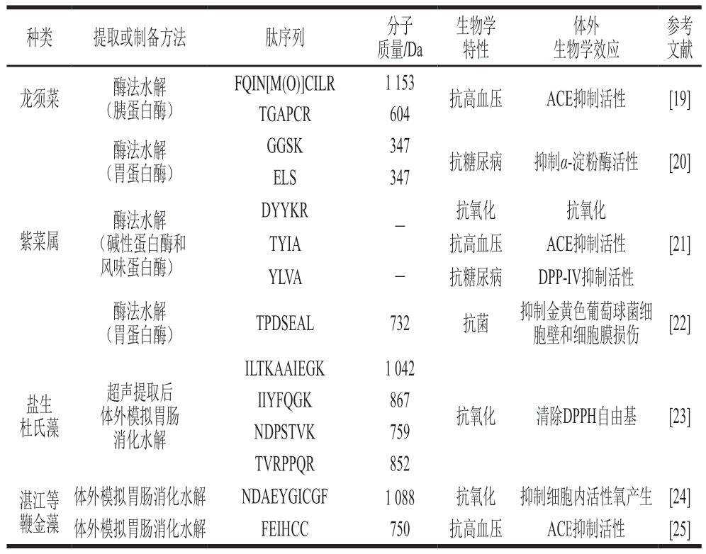 表1 近5 年从藻类中提取的生物活性肽研究