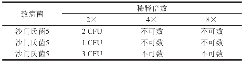 致病菌稀释倍数2×4×8×沙门氏菌52 CFU不可数不可数沙门氏菌51 CFU不可数不可数沙门氏菌53 CFU不可数不可数