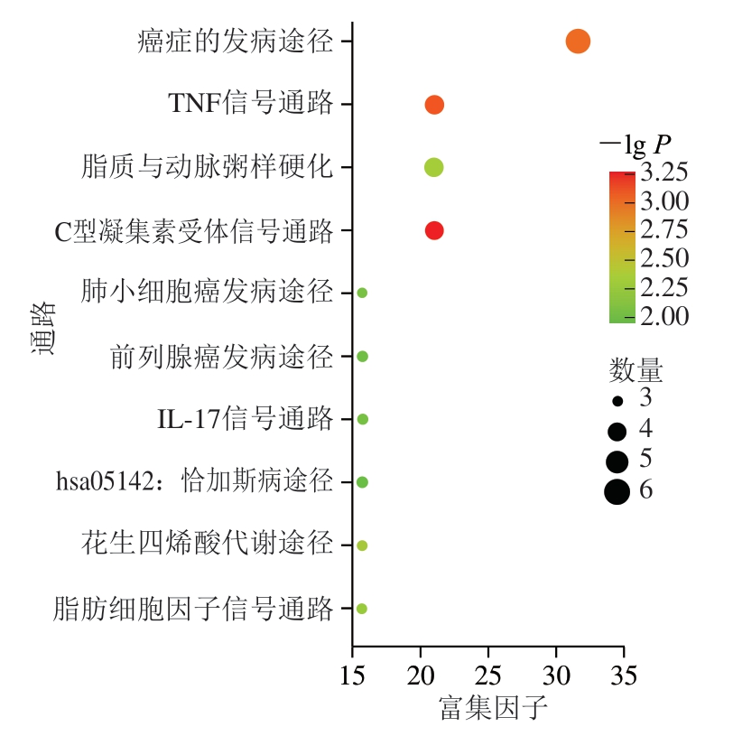 对藤茶黄酮类化合物和抑菌的交集靶点进行GO分析,得到P<0.05的BP条目有42 条,CC条目有4 条,MF条目有10 条。排名靠前的条目如图4所示,其中BP主要涉及凋亡过程的负调控、一氧化氮生物合成过程的正向调控、对糖皮质激素的应答等,CC主要涉及细胞外间隙、胞外区、细胞表面等;MF主要涉及酶结合、相同蛋白结合、转录顺式调控结合等。对对藤茶黄酮类化合物和抑菌的交集靶点进行KEGG分析,得到P<0.05的信号通路23 条,其中前10 条如图5所示,主要为癌症的发病途径、TNF信号通路、C型凝集素受体信号通路等,与藤茶黄酮类化合物的抑菌功效相关性较高。