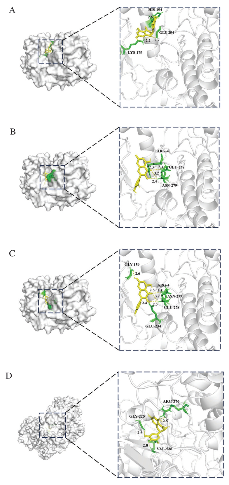 图6 藤茶黄酮类化合物与抑菌相关靶点分子对接模式图