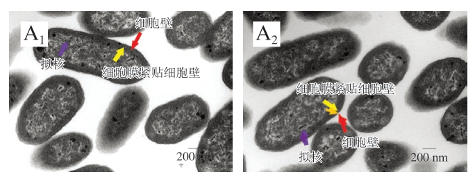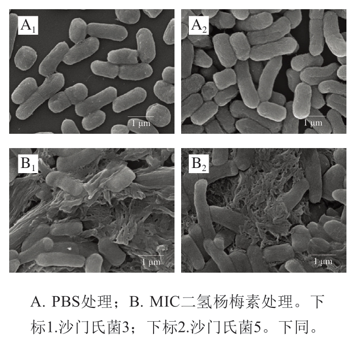 依据1.3.2.2节结果,筛选出二氢杨梅素抑菌效果明显的2 株菌,设置药物组和对照组,药物组为含1 MIC二氢杨梅素的菌液,对照组为等体积PBS的菌液,菌液浓度约5×106 CFU/mL,37 ℃、280 r/min振荡10 h培养至对数生长末期。将各组细菌3 000 r/min离心5 min收集细菌,PBS洗涤3 次,沉淀用PBS稀释至合适浓度,离心收集细菌至肉眼可见细菌沉淀为芝麻至绿豆大小,弃培养基后用PBS轻轻漂洗后,以体积分数2.5%戊二醛溶液预固定,质量分数1%四氧化锇溶液再固定,丙酮逐级脱水,脱水剂和包埋剂按照3∶1、1∶1、1∶3体积比依次渗透后用Epon-812纯包埋剂包埋,用超薄切片机制备60~90 nm超薄切片并捞至铜网上,然后先用醋酸铀染色10~15 min,再用柠檬酸铅染色1~2 min,采用JSMIT700HR扫描电镜、JEM-1400 FLASH透射电子显微镜对铜网进行图像采集,每张铜网先于低倍下观察全部组织,选择要观察的区域采集图片,观察具体病变。