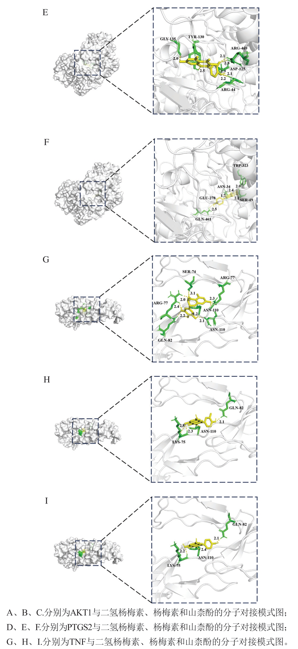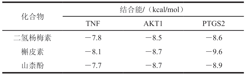 化合物结合能/(kcal/mol)TNFAKT1PTGS2二氢杨梅素—7.8—8.5—8.6槲皮素—8.1—8.7—9.6山柰酚—7.7—8.7—8.9
