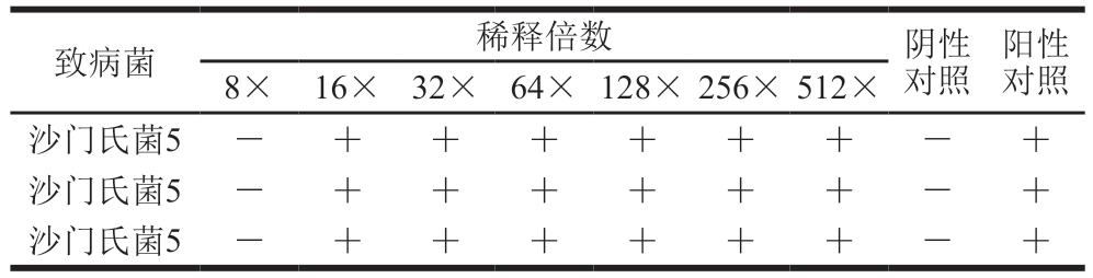 致病菌稀释倍数阴性对照阳性对照8×16×32×64×128×256×512×沙门氏菌5—++++++—+沙门氏菌5—++++++—+沙门氏菌5—++++++—+