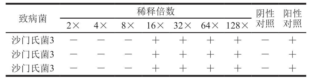 致病菌稀释倍数阴性对照阳性对照2×4×8×16×32×64×128×沙门氏菌3——++++—+沙门氏菌3——++++—+沙门氏菌3——++++—+
