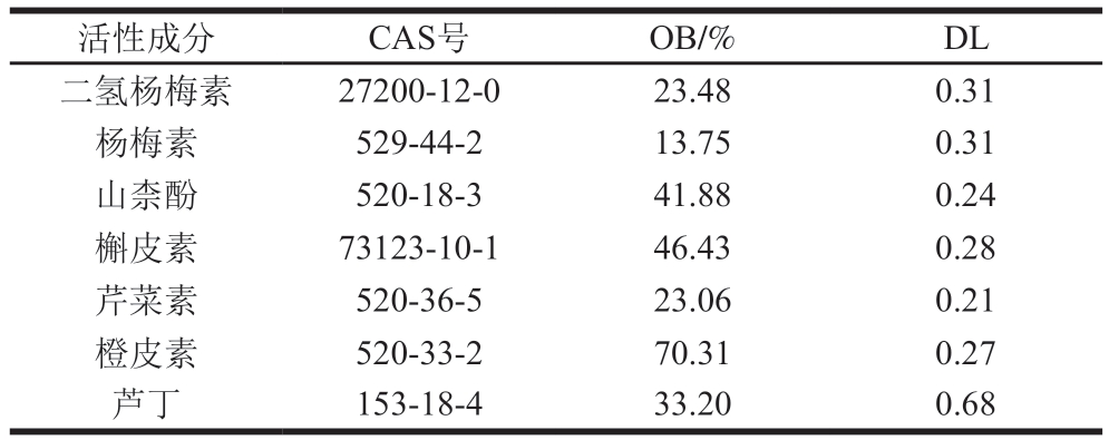 活性成分CAS号OB/%DL二氢杨梅素27200-12-023.480.31杨梅素529-44-213.750.31山柰酚520-18-341.880.24槲皮素73123-10-146.430.28芹菜素520-36-523.060.21橙皮素520-33-270.310.27芦丁153-18-433.200.68