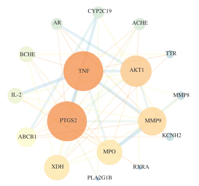 如图3所示,构建蛋白互作网络,其中度值排名靠前的5 位分别为PTGS2、TNF、AKT1、MMP9、MPO等,其中度值大于2 倍中位数的靶点有两个,分别为PTGS2、TNF,其可能是藤茶黄酮类化合物抑菌的核心靶点。