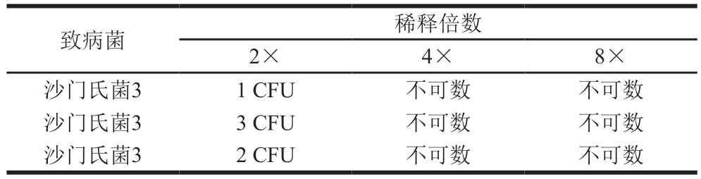 致病菌稀释倍数2×4×8×沙门氏菌31 CFU不可数不可数沙门氏菌33 CFU不可数不可数沙门氏菌32 CFU不可数不可数