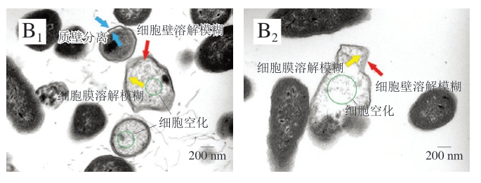 透射电镜观察结果显示,与空白组(图8A)相比,经二氢杨梅素处理后,细菌出现质壁分离、细胞壁溶解模糊、细胞膜溶解模糊、内容物溶解、细胞空化(图8B)。