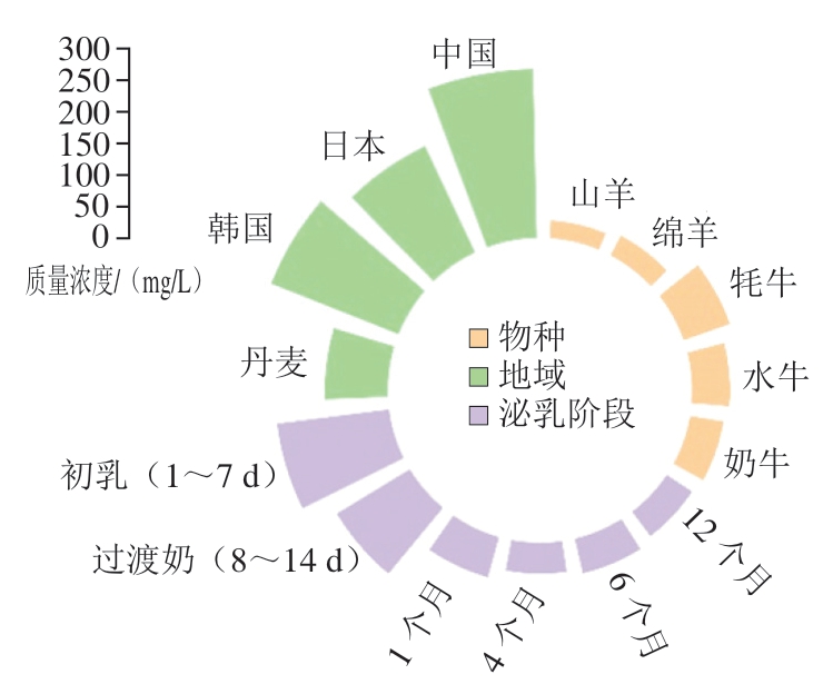 除了物种间的含量差异,其含量可能会因地理差异、饮食差异、泌乳期、胎次以及个体而不同(图1)[11,13-15]。有研究显示,能量摄入不足(<1 800 kcal/d)的哺乳期女性,其母乳OPN质量浓度显著低于正常摄入组(P<0.05);高蛋白质摄入(>15%总能量)与OPN水平正相关(r=0.32,P=0.02),可能与氨基酸代谢影响乳腺合成相关[5,16]。一项针对中国、日本、韩国和丹麦母亲的大型多中心队列研究发现,平均母乳OPN水平存在较大的地理差异,丹麦母亲(平均产后17.4 周)为99.7 mg/L,日本母亲为185.0 mg/L(平均产后9.1 周),韩国母亲为216.2 mg/L(平均产后3.9 周),中国母亲(平均产后3.9 周)为266.2 mg/L[17],可能与东亚传统高钙饮食(如豆制品、鱼类)促进乳腺OPN分泌有关。最近研究也证明了这种地理差异以及哺乳期导致的OPN含量下降,通过酶联免疫吸附试验(enzymelinked immunosorbent assay,ELISA)和UPLC-MS/MS确定中国母亲的乳汁OPN水平为300~350 mg/L(产后1~2 周)和137.1 mg/L(泌乳的第3个月),土耳其和美国母亲为178 mg/L(产后1 周)[5,16]。母乳OPN质量浓度随哺乳期延长呈下降趋势。产后72 h至7 d的初乳OPN质量浓度可高达1 493.4 mg/L,而产后11~14 个月降至412.7 mg/L[9]。此外,研究表明,OPN水平随胎次而降低,OPN含量随泌乳时间的延长而显著增加。Dudemaine等[18]研究也发现在哺乳期第25周后观察到牛乳OPN水平显著增加。Christensen等[11]研究发现丹麦荷斯坦奶牛之间的OPN含量存在相当大的个体差异,水平从0.4 mg/L到67.8 mg/L不等。
