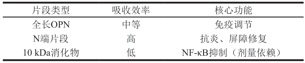 片段类型吸收效率核心功能全长OPN中等免疫调节N端片段高抗炎、屏障修复10 kDa消化物低NF-κB抑制(剂量依赖)