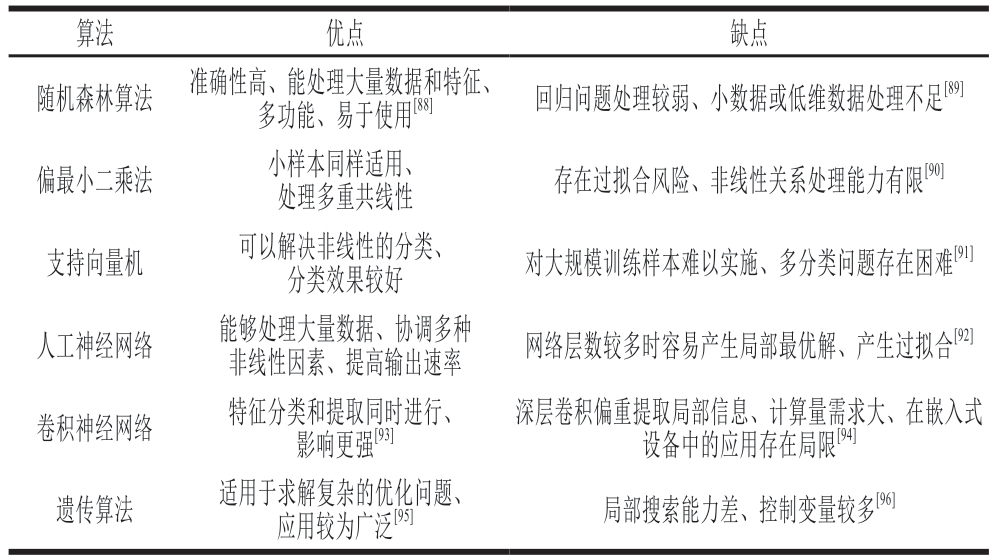 算法优点缺点随机森林算法准确性高、能处理大量数据和特征、多功能、易于使用[88]回归问题处理较弱、小数据或低维数据处理不足[89]偏最小二乘法小样本同样适用、处理多重共线性存在过拟合风险、非线性关系处理能力有限[90]支持向量机可以解决非线性的分类、分类效果较好对大规模训练样本难以实施、多分类问题存在困难[91]人工神经网络能够处理大量数据、协调多种非线性因素、提高输出速率网络层数较多时容易产生局部最优解、产生过拟合[92]卷积神经网络特征分类和提取同时进行、影响更强[93]深层卷积偏重提取局部信息、计算量需求大、在嵌入式设备中的应用存在局限[94]遗传算法适用于求解复杂的优化问题、应用较为广泛[95]局部搜索能力差、控制变量较多[96]