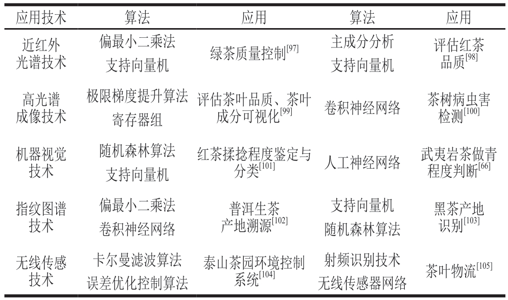 应用技术算法应用算法应用近红外光谱技术偏最小二乘法绿茶质量控制[97]主成分分析评估红茶品质[98]支持向量机支持向量机高光谱成像技术极限梯度提升算法评估茶叶品质、茶叶成分可视化[99]卷积神经网络茶树病虫害检测[100]寄存器组机器视觉技术随机森林算法红茶揉捻程度鉴定与分类[101]人工神经网络武夷岩茶做青程度判断[66]支持向量机指纹图谱技术偏最小二乘法普洱生茶产地溯源[102]支持向量机黑茶产地识别[103]卷积神经网络随机森林算法无线传感技术射频识别技术茶叶物流[105]误差优化控制算法无线传感器网络卡尔曼滤波算法泰山茶园环境控制系统[104]