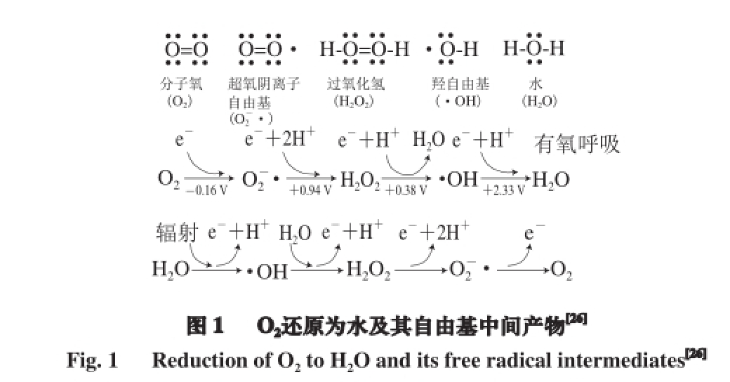 自由基是指“能够独立存在、含一个或多个未配对电子的任何物质”,一个未配对电子自身占据一个原子轨道[18],是极不稳定的分子。考虑到基态氧在其最外层反键轨道有两个未配对电子,因此可归类为自由基[22]。O2最外层轨道的两个孤对电子具有相同的自旋量子数,对接受电子产生自旋限制[23]。因此,当其被还原为水时,O2一次只能接受一个电子,便可以产生几种自由基中间产物,即超氧阴离子(O