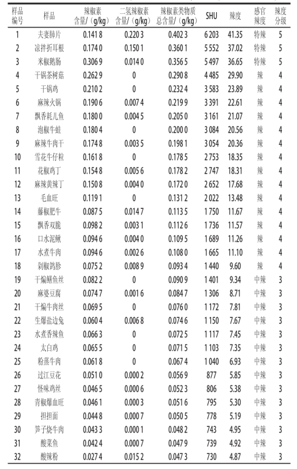 样品编号样品辣椒素含量/(g/kg)辣度分级1夫妻肺片0.141 80.220 30.402 36 20341.35特辣5 2凉拌折耳根0.174 00.150 10.360 15 55237.02特辣5 3米椒鹅肠0.306 90.014 00.356 55 49736.65特辣5 4干锅茶树菇0.262 900.290 84 48529.90辣4 5干锅鸡0.210 200.232 43 58323.89辣4 6麻辣火锅0.190 60.007 40.219 93 39122.61辣4 7飘香耗儿鱼0.180 00.004 50.205 03 16121.07辣4 8泡椒牛蛙0.180 400.200 03 08420.56辣4 9麻辣牛肉干0.174 80.003 50.198 13 05420.36辣4 10雪花牛仔粒0.161 800.178 52 75318.35辣4 11花椒鸡丁0.154 80.005 60.178 22 74718.31辣4 12麻辣黄辣丁0.150 80.004 00.172 02 65217.68辣4 13毛血旺0.119 100.131 22 02213.48辣4 14藤椒肥牛0.087 50.014 70.113 51 75011.67辣4 15飘香双脆0.098 20.003 10.112 61 73611.57辣4 16口水泥鳅0.094 60.004 00.109 51 68911.26辣4 17水煮牛肉0.094 60.002 60.108 01 66511.10辣4 18剁椒鸽胗0.075 20.008 90.093 41 4409.60辣4 19干煸鳝鱼丝0.082 200.090 91 4019.34中辣3 20麻婆豆腐0.074 70.001 60.084 71 3068.71中辣3 21干煸牛肉丝0.069 500.076 01 1727.81中辣3 22生爆盐边兔0.060 40.006 80.074 61 1507.67中辣3 23水煮香辣鱼0.066 300.072 51 1177.45中辣3 24太白鸡0.065 500.071 51 1037.35中辣3 25粉蒸牛肉0.061 800.067 41 0406.93中辣3 26过江豆花0.051 00.000 20.056 98775.85中辣3 27怪味鸡丝0.046 50.000 60.052 38065.38中辣3 28青椒爆血旺0.046 10.000 30.051 67955.30中辣3 29担担面0.044 80.000 70.050 57785.19中辣3 30笋子烧牛肉0.043 30.000 10.048 27434.95中辣3 31酸菜鱼0.042 40.000 70.047 97394.92中辣3 32酸辣粉0.027 40.015 20.047 37304.87中辣3二氢辣椒素含量/(g/kg)总含量/(g/kg)SHU辣度感官辣度辣椒素类物质