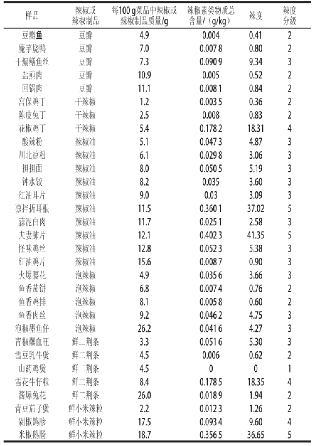含量/(g / k g)辣度辣度分级豆瓣鱼豆瓣4 . 9 0 . 0 0 4 0 . 4 1 2魔芋烧鸭豆瓣7 . 0 0 . 0 0 7 8 0 . 8 0 2干煸鳝鱼丝豆瓣7 . 3 0 . 0 9 0 9 9 . 3 4 3盐煎肉豆瓣1 0 . 9 0 . 0 0 5 0 . 5 2 2回锅肉豆瓣1 1 . 1 0 . 0 0 8 1 0 . 8 4 2宫保鸡丁干辣椒1 . 2 0 . 0 0 3 5 0 . 3 6 2陈皮兔丁干辣椒2 . 5 0 . 0 0 8 0 . 8 3 2花椒鸡丁干辣椒5 . 4 0 . 1 7 8 2 1 8 . 3 1 4酸辣粉辣椒油5 . 1 0 . 0 4 7 3 4 . 8 7 3川北凉粉辣椒油6 . 1 0 . 0 2 9 8 3 . 0 6 3担担面辣椒油8 . 0 0 . 0 5 0 5 5 . 1 9 3钟水饺辣椒油8 . 2 0 . 0 3 5 3 . 6 0 3红油耳片辣椒油9 . 0 0 . 0 3 3 . 0 9 3凉拌折耳根辣椒油1 1 . 5 0 . 3 6 0 1 3 7 . 0 2 5蒜泥白肉辣椒油1 1 . 7 0 . 0 2 5 1 2 . 5 8 3夫妻肺片辣椒油1 2 . 1 0 . 4 0 2 3 4 1 . 3 5 5怪味鸡丝辣椒油1 2 . 8 0 . 0 5 2 3 5 . 3 8 3红油鸡片辣椒油1 5 . 6 0 . 0 0 8 7 0 . 9 0 3火爆腰花泡辣椒4 . 9 0 . 0 3 5 6 3 . 6 6 3鱼香茄饼泡辣椒6 . 8 0 . 0 0 7 4 0 . 7 6 2鱼香鸡排泡辣椒8 . 1 0 . 0 0 5 8 0 . 6 0 2鱼香肉丝泡辣椒9 . 2 0 . 0 4 6 2 4 . 7 5 3泡椒墨鱼仔泡辣椒2 6 . 2 0 . 0 4 1 6 4 . 2 7 3青椒爆血旺鲜二荆条3 . 3 0 . 0 5 1 6 5 . 3 0 3雪豆乳牛煲鲜二荆条4 . 5 0 . 0 0 6 0 . 6 2 2山药鸡煲鲜二荆条4 . 5 0 0 1雪花牛仔粒鲜二荆条8 . 4 0 . 1 7 8 5 1 8 . 3 5 4酱爆兔花鲜二荆条2 6 . 0 0 . 0 1 8 9 1 . 9 4 2青豆茄子煲鲜小米辣粒2 . 2 0 . 0 1 2 3 1 . 2 6 2剁椒鸽胗鲜小米辣粒1 7 . 5 0 . 0 9 3 4 9 . 6 0 4米椒鹅肠鲜小米辣粒1 8 . 7 0 . 3 5 6 5 3 6 . 6 5 5样品辣椒或辣椒制品每1 0 0 g菜品中辣椒或辣椒制品质量/ g辣椒素类物质总