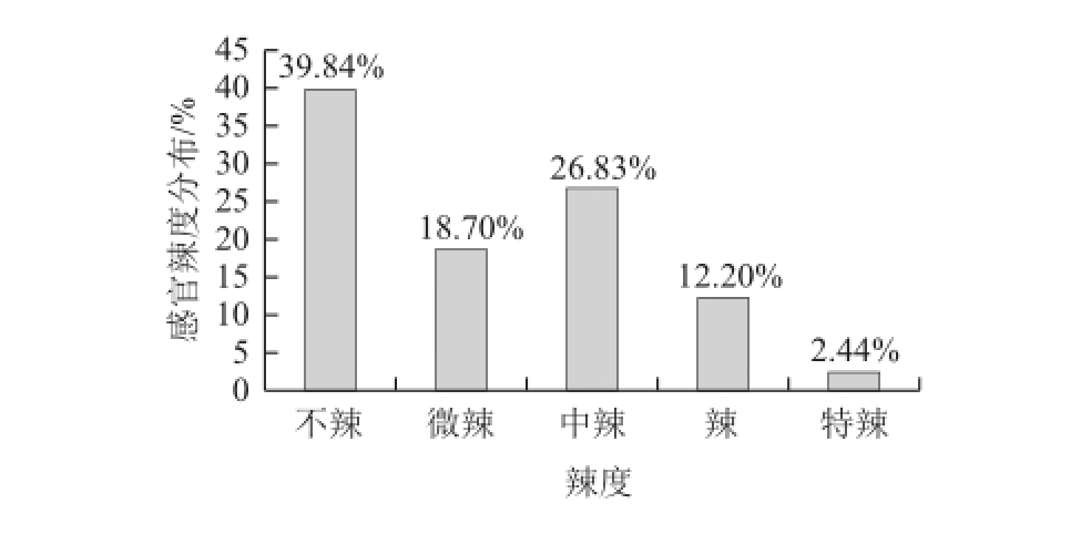 选取四川地区的感官鉴评人员共20 名,对样品按照不辣、微辣、中辣、辣和特辣5 个等级进行感官评价。