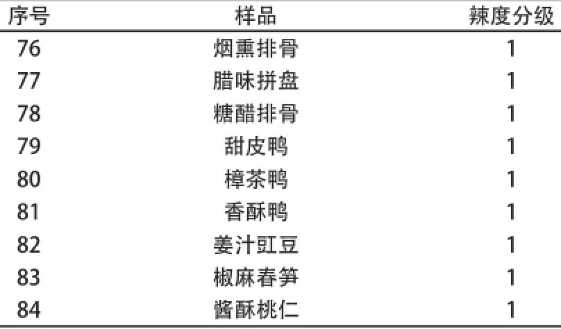 序号样品辣度分级76烟熏排骨1 77腊味拼盘1 78糖醋排骨1 79甜皮鸭1 80樟茶鸭1 81香酥鸭1 82姜汁豇豆1 83椒麻春笋1 84酱酥桃仁1