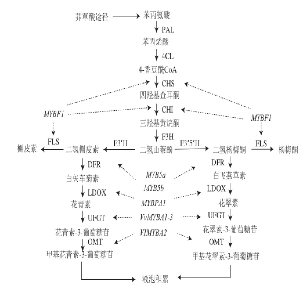 图1 葡萄中花色苷生物合成途径及MYB相关转录因子基因作用位点