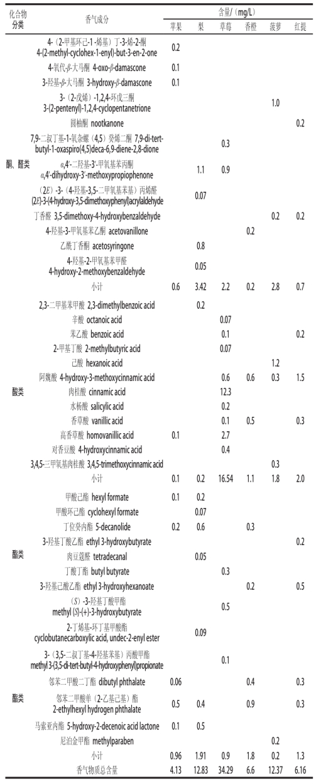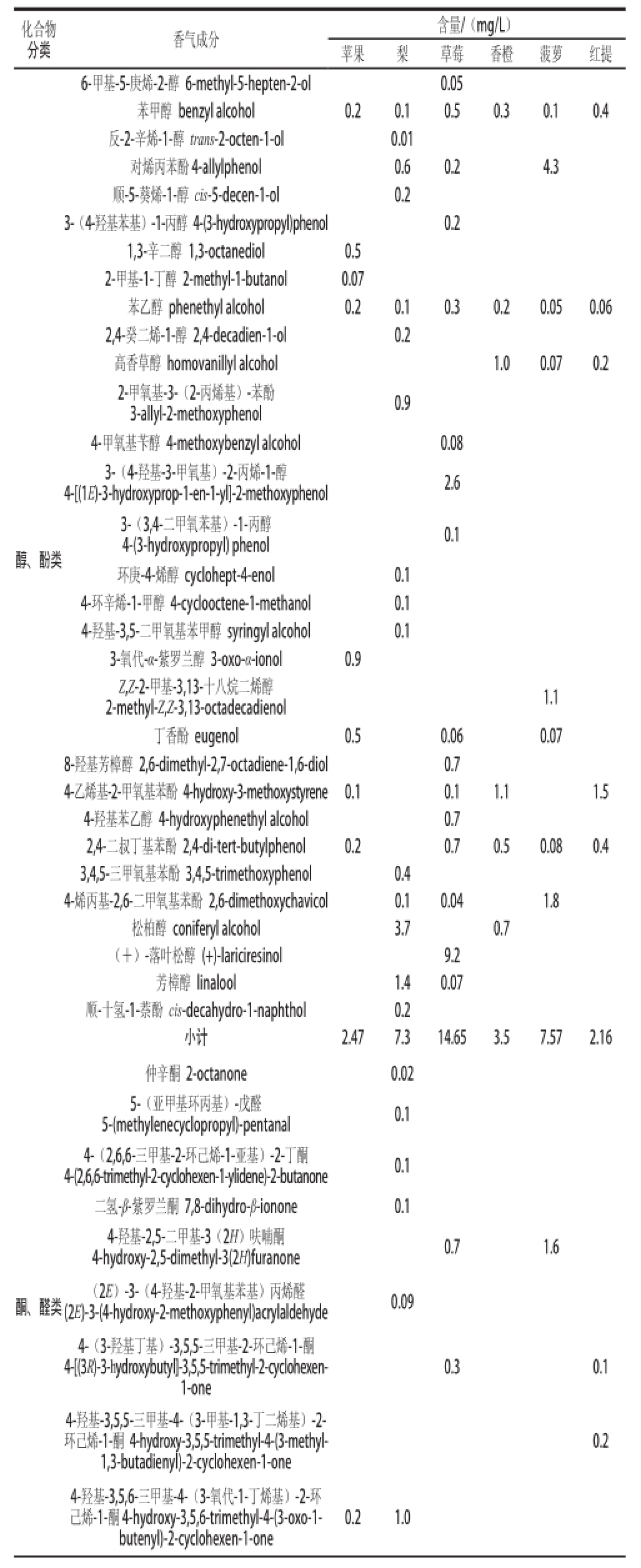 表1中鉴定出的部分键合态香气成分在文献中鲜见报道,如苹果中4-羟基-3,5,6-三甲基-4-(3-氧代-1-丁烯基)-2-环己烯-1-酮、4-(2-甲基环己-1-烯基)丁-3-烯-2-酮、丁位癸内酯和马索亚内酯,梨中2,4-癸二烯-1-醇、4-羟基-3,5,6-三甲基-4-(3-氧代-1-丁烯基)-2-环己烯-1-酮和马索亚内酯,草莓中3-(4-羟基苯基)-1-丙醇、3-(3,4-二甲氧苯基)-1-丙醇、丁酸丁酯、(S)-3-羟基丁酸甲酯和3-(3,5-二叔丁基-4- 羟基苯基)丙酸甲酯,香橙中乙酰香草酮,菠萝中尼泊金甲酯,红提中4-(3-羟基丁基)-3,5,5-三甲基-2-环己烯-1-酮和4-羟基-3,5,5-三甲基-4-(3-甲基-1,3-丁二烯基)-2-环己烯-1-酮等。