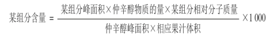 定性主要由GC-MS中NIST 05质谱数据库检索,根据匹配度和保留时间进行人工解析。定量是以仲辛醇作为内标物,按下式由内标法计算得出: