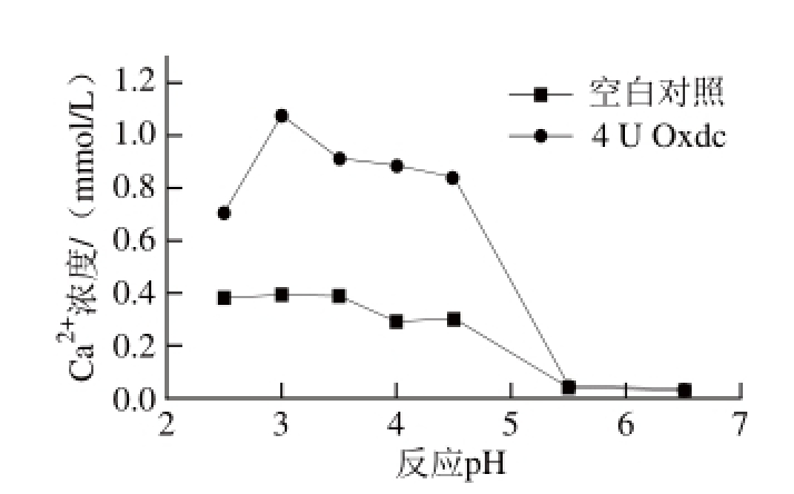 准确称取25 mg(精确至0.000 1 g)草酸钙结晶置于锥形瓶中,加入10 mL模拟尿液,调节pH值分别至2.5、3.0、3.5、4.0、4.5、5.5、6.5,分别加入4 U Oxdc,混匀后,37 ℃恒温振荡进行溶解反应1 周,并做空白对照实验(不加Oxdc);设计3 组平行实验,测定体系中Ca 2+的浓度,取平均值。