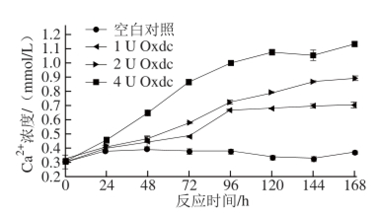 如图2所示,添加不同酶量的Oxdc对催化草酸钙结晶溶解的速率有很大的影响。随Oxdc用量的增加及反应时间的延长,催化草酸钙结晶溶解产生的Ca 2+增多;添加1 U Oxdc的催化反应在96 h前Ca 2+浓度呈现逐渐上升的趋势,随后基本保持平衡。添加2 U Oxdc的催化反应中,随着反应时间的延长,体系中Ca 2+的浓度逐渐上升,并在168 h后Ca 2+浓度达到最大值0.89 mmol/L,相当于溶解了1.30 mg的草酸钙结晶。添加4 U Oxdc的催化反应中,随着反应时间的延长,草酸钙结晶溶解的速率明显加快,并在120 h时趋于平缓,反应进行168 h后,体系中Ca 2+浓度达到最大值1.14 mmol/L,相当于溶解了1.67 mg的草酸钙结晶。而不加Oxdc的空白对照组中Ca 2+浓度基本保持不变,说明Oxdc可催化草酸钙结晶进行进一步的溶解。