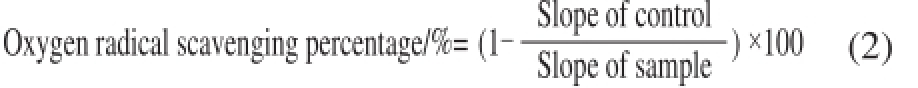 Oxygen radical scavenging activity was measured based on the pyrogallol autoxidation method described by Li Xican et al. [16]. Briefly, the different concentrations of samples was mixed with Tris-HCl buffer (0.05 mol/L, pH 8.2) containing EDTA (1 mmol/L) and pyrogallol (80 µL, 6 mmol/L), and then shaken rapidly at room temperature. The absorbance of the mixture was measured at 325 nm against the Tris-HCl buffer as blank per 30 s for 5 min. The reaction mixture without a sample was used as the negative control. The slope of the correlation of absorbance with time was calculated. The oxygen radical scavenging ability was calculated as equation (2):