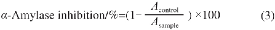 The hypoglycemic activity in vitro was evaluated by inhibition of α-amylase activity using enzyme-starch system [17]. A sample was mixed by stirring with 25 mL potato starch (4%) in a beaker, then 100 mg of α-amylase was added,stirred vigorously and incubated at 37 ℃ for 60 min. After the incubation period, 2 mL of 0.1 mol/L NaOH was added to terminate enzyme activity. The mixture was centrifuged at 3 000×g for 15 min and glucose content was measured in the supernatant. A control test was also run without the addition of test sample. Inhibition of α-amylase activity was calculated as equation (3):