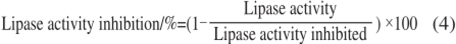 Hypolipidemic activity in vitro was evaluated by inhibition of lipase activity which was determined by the rate of oleic acid released from triolein [18]. The substrate emulsion was prepared by sonicating triolein (160 mg) with 3 mL of TCA-Na (0.83 mg/mL) in a 0.1 mol/L Tris-HCl buffer (pH 7.4) for 60 min. Different concentrations of samples were mixed with the diluted substrate emulsion and sonicated for 60 min. The mixture was incubated with 0.1 mg/mL of pancreatic lipase (0.2 mL/0.108 U) for 30 min at 37 ℃. The enzyme reaction was terminated by incubation in boiling water for 2 min. The amount of oleic acid released in the suspension was measured by a commercially available kit. Inhibition of lipase activity was calculated as equation (4):