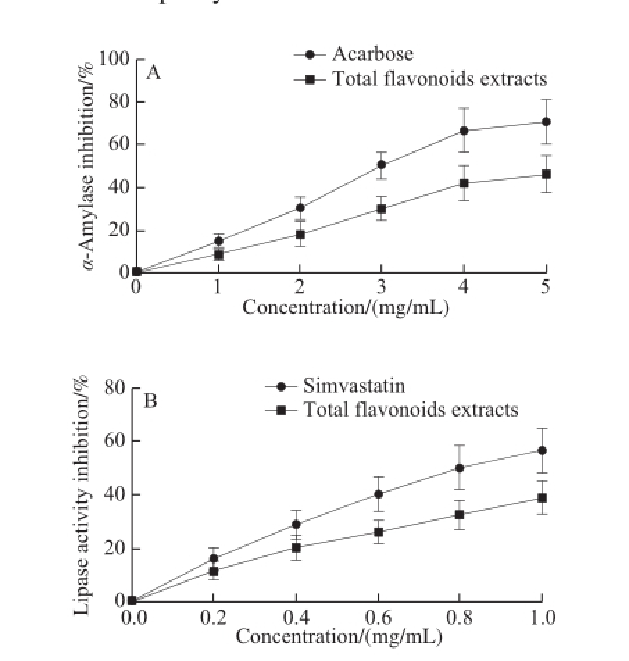 Fig.7 Inhibitory effects of total flavonoids from Suaeda salsa on α-amylase (A) and pancreatic lipase (B) activities