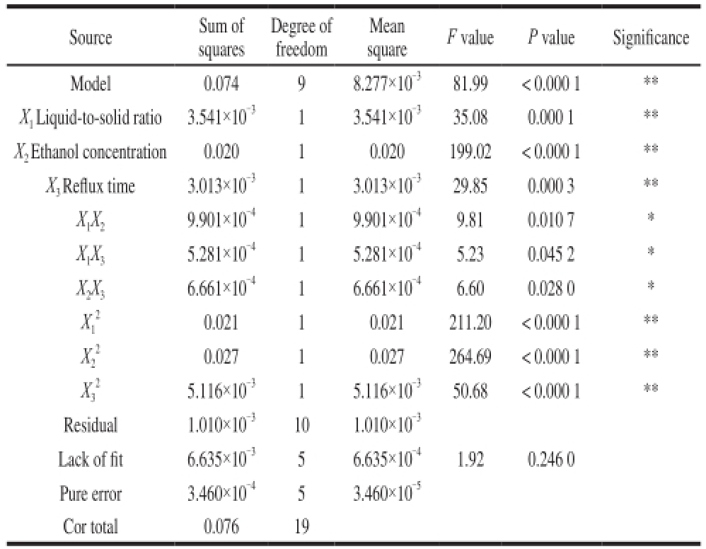 SourceSum of squares Degree of freedom Mean squareF valueP valueSignificance Model0.07498.277×10 -381.99< 0.000 1** X 1Liquid-to-solid ratio3.541×10 -313.541×10 -335.080.000 1** X 2 Ethanol concentration0.02010.020199.02< 0.000 1** X 3Reflux time3.013×10 -313.013×10 -329.850.000 3** X 1X 29.901×10 -419.901×10 -49.810.010 7* X 1X 35.281×10 -415.281×10 -45.230.045 2* X 2X 36.661×10 -416.661×10 -46.600.028 0* X 10.02110.021211.20< 0.000 1** X2 2 5.116×10 -315.116×10 -350.68< 0.000 1** Residual1.010×10 -3101.010×10 -3Lack of fit6.635×10 -356.635×10 -41.920.246 0 Pure error3.460×10 -453.460×10 -5Cor total0.07619 0.02710.027264.69< 0.000 1** X3 22