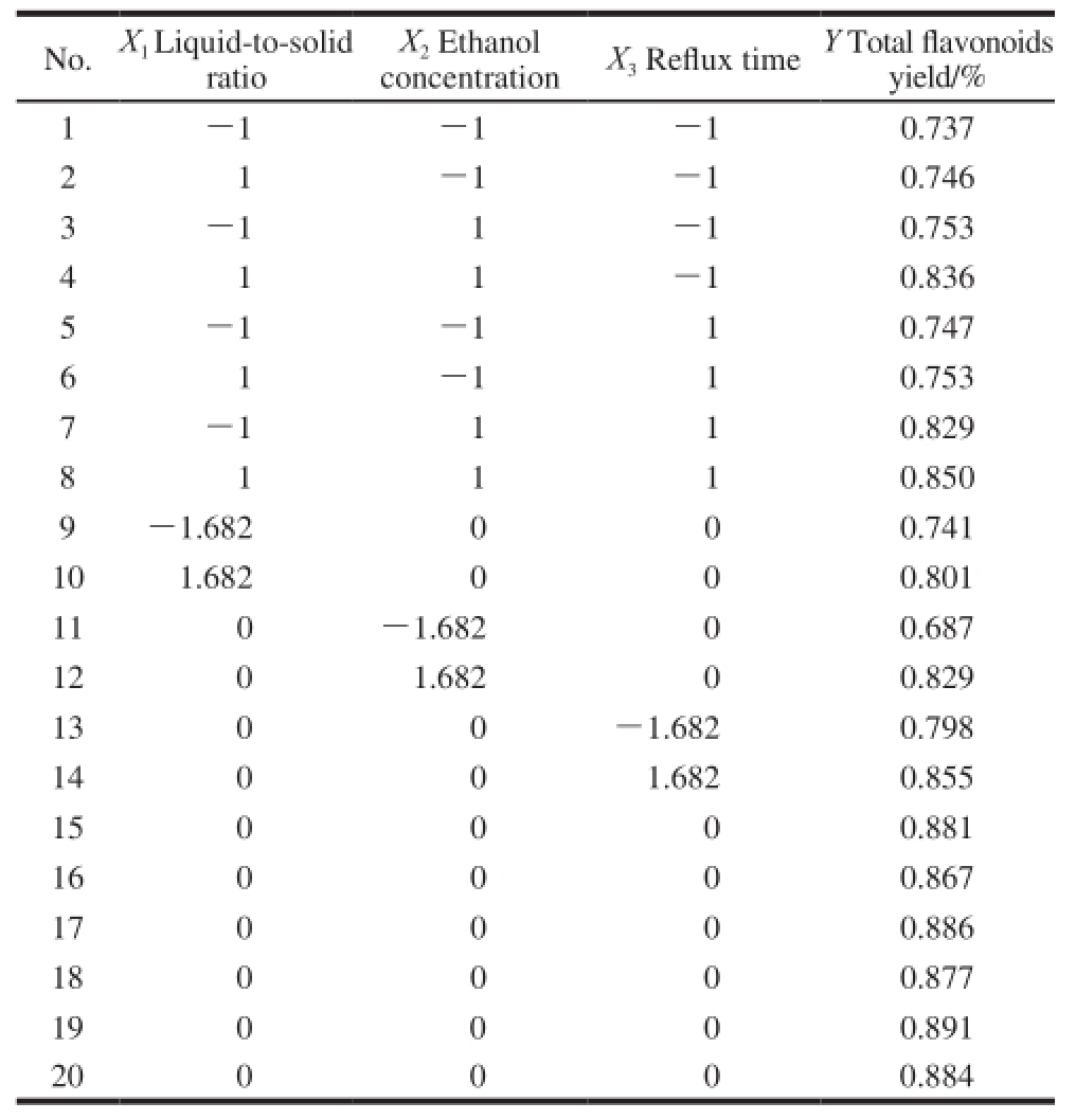 No.X 1Liquid-to-solid ratio concentrationX 3Reflux timeY Total flavonoidsyield/% X 2Ethanol 1-1-1-10.737 2 1 -1-10.746 3-11-10.753 4 1 1 -10.836 5-1-110.747 6 1 -110.753 7-1110.829 8 1 1 1 0.850 9-1.682000.741 101.682000.801 110-1.68200.687 1201.68200.829 1300-1.6820.798 14001.6820.855 150000.881 160000.867 170000.886 180000.877 190000.891 200000.884