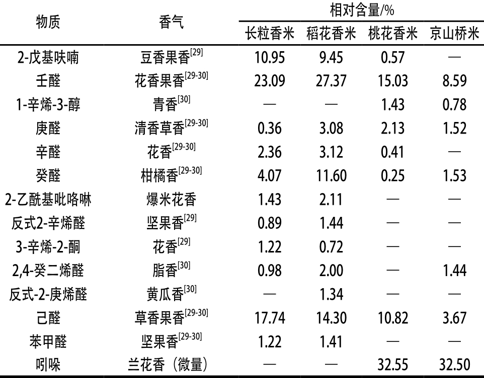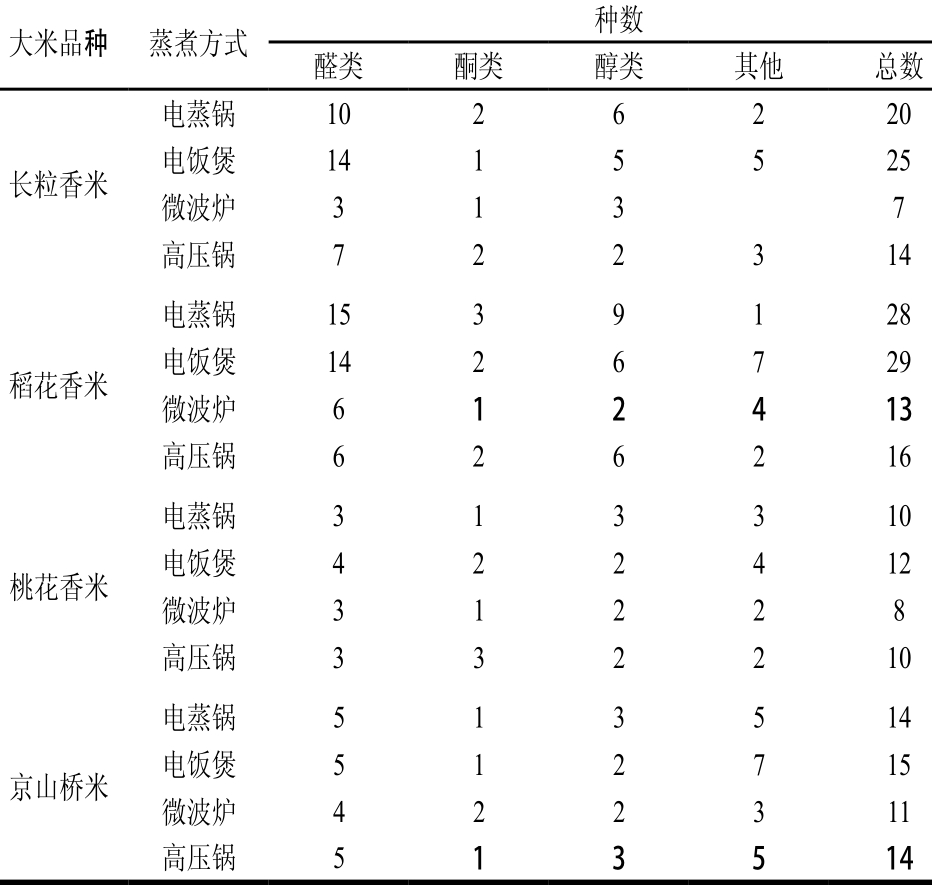 表4和表5为经SPME-GC-MS法分析不同烹煮方式米饭的风味物质分析结果。长粒香米和稻花香米2 种粳米中分别检测出风味物质39 种和45 种,桃花香米和京山桥米2 种籼米中分别检测到风味物质18 种和20 种。具体的风味物质种类见表4。同时,长粒香米和稻花香米作为粳米的代表,含有果香和花香的物质较多(壬醛、辛醛、3-辛烯-2-酮等),因此粳米香气更加浓郁香甜。桃花香米和京山桥米为代表的籼米,含有清香气味的物质较多(吲哚、庚醛、1-辛烯-3-醇等),因此籼米香气与粳米相比偏向于清香型。